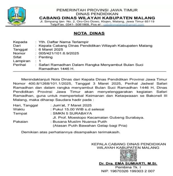 Kepala Cabang Dinas Pendidikan (Kacabdin) Malang tetap nekat hari ini mengadakan acara Safari Ramadhan, disaat pemerintah sedang melakukan efisiensi anggaran.