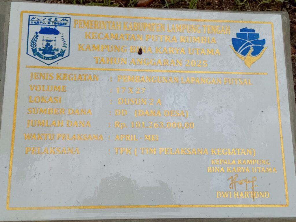 ditemukan dugaan penyimpangan anggaran dana desa di tahun anggaran 2025 yang terindikasi sebagai Tindak Pidana Korupsi yang di duga di lakukan oleh Oknum Kepala Kampung Bina Karya Utama, Kecamatan Putra Rumbia, Lampung Tengah.