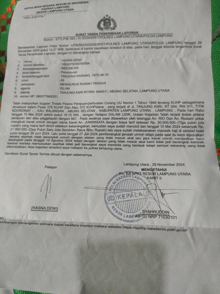 MO: pada awalnya saya ditawarkan oleh tetangga An. Rio dan An. Rustam untuk mengikuti travel umroh dengan nama travel Juni wisata dengan biaya tarif sebesar 30 juta rupiah yang mana tarif dicicil sebelum keberangkatan kemudian saya sudah mencicil dari tanggal 15 Mei 2024 sebanyak 21.900.000 lalu saya sudah melaksanakan manasik haji di swivel hotel pada tanggal 26 juni 2024 lalu pada tanggal 27 juni 2024 tempat haji umroh tetapi pada saat itu kami diputuskan secara sepihak tidak diberangkatkan umroh dengan alasan tidak masuk akal lalu jasa travel umroh menjanjikan kami berangkat pada tanggal 15 Agustus 2024 tapi dengan alasan yang tidak masuk akal kami tidak jadi berangkat kembali karena mereka memutuskan supaya tidak jadi berangkat, saya meminta uang kembali tapi sampai sekarang uang tidak dikembalikan Atas kejadian tersebut saya melapor ke Polres Lampung Utara demikian surat tanda terima dibuat dengan sebenarnya.