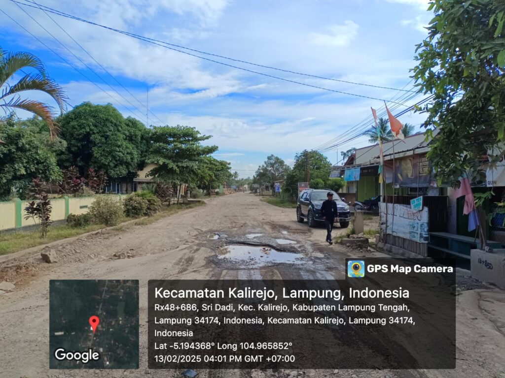 Lampung Tengah (Ungkap Tipikor) – Kerusakan jalan yang sangat parah terjadi di Jalan Sridadi, Kecamatan Kalirejo, Kabupaten Lampung Tengah.