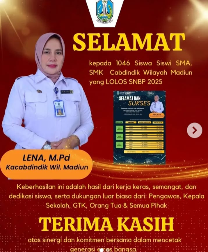 Ibu Lena,M.pd selaku Kepala cabang dinas pendidikan ( Kacab Dindik) Wilayah Madiun sangat bangga dengan keberhasilan peserta didik yang mana di tahun 2025 ini sebanyak 1.046 murid ,SMAn ,SMAs ,Serta SMKn,SMKs Kota Madiun,Kabupaten Madiun Serta Kabupaten Ngawi diterima Jalur SNBP pada tahun 2025 ini.