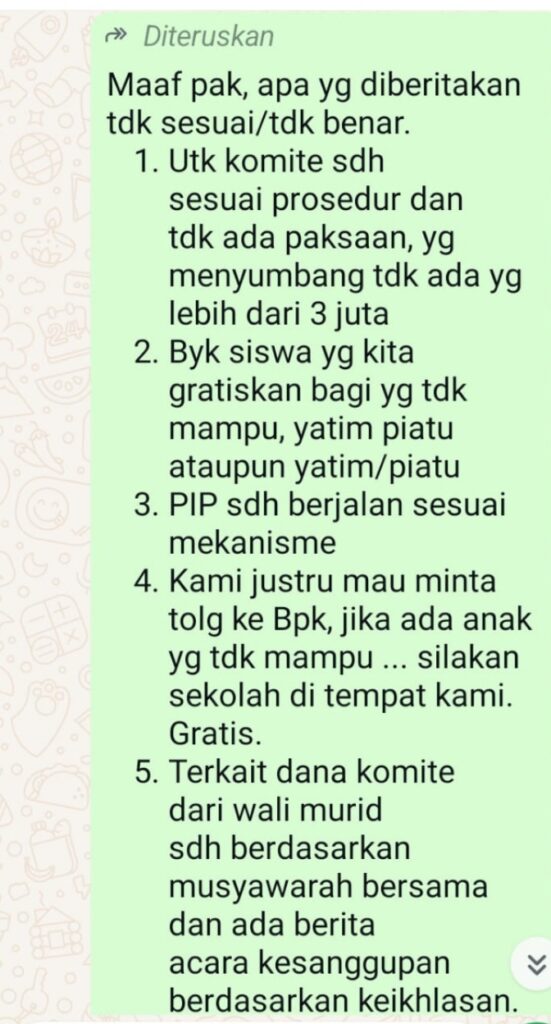 Dari hak jawab Kepala sekolah jelas sangat bertentangan dengan aturan dan peraturan tentang komite. Sesuai dengan Peraturan Menteri Pendidikan no 75 thn 2016, mengenai tugas komite sekolah, pasal 3, tugas komite sekolah adalah menggalang dana dan sumber daya pendidikan lainnya melalui upaya kreatif dan inovatif. Komite sekolah dilarang melakukan pungutan dari peserta didik atau orang tua. Jadi, tugas komite sekolah itu mencari atau menggalang dana diluar sekolah. Pasal 10 ayat 4, hasil pemungutan dana dibukukan pada rekening bersama antara komite sekolah dan pihak sekolah, dan ini wajib diaudit.