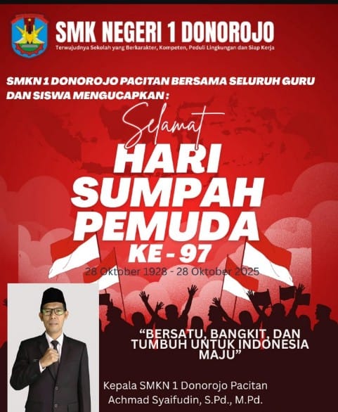 Donorojo, Pacitan (Ungkap Tipikor) – Dalam semangat memperingati Hari Sumpah Pemuda ke-97 tahun 2025, SMKN 1 DONOROJO PACITAN KEC DONOROJO KAB PACITAN PROv JAWA TIMUR BAPAK AHMAD SYAIFUDIN mengajak seluruh pemuda dan pemudi untuk terus bergerak, berkarya, dan bersatu dalam menjaga keutuhan serta kemajuan bangsa Indonesia (27/10).