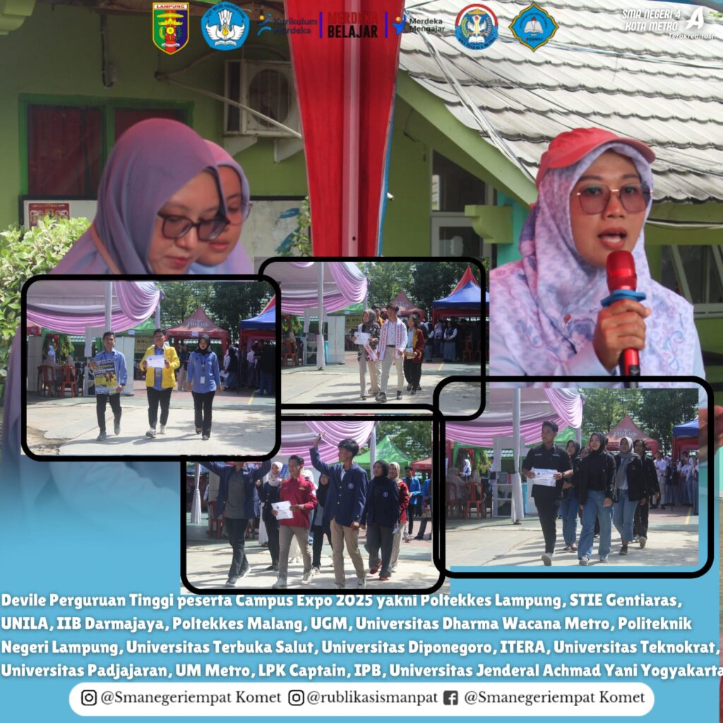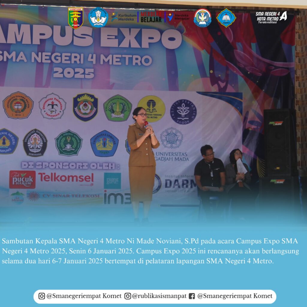 “Selamat datang kami ucapkan di SMA Negeri 4 Metro, bagi seluruh perwakilan perguruan tinggi baik negeri maupun swasta yang ada di dalam maupun luar provinsi Lampung. Apresiasi kepada 17 Perguruan Tinggi yang telah menyempatkan hadir dan mengisi Campus Expo 2025 di SMA Negeri 4 Metro,”ucapnya.