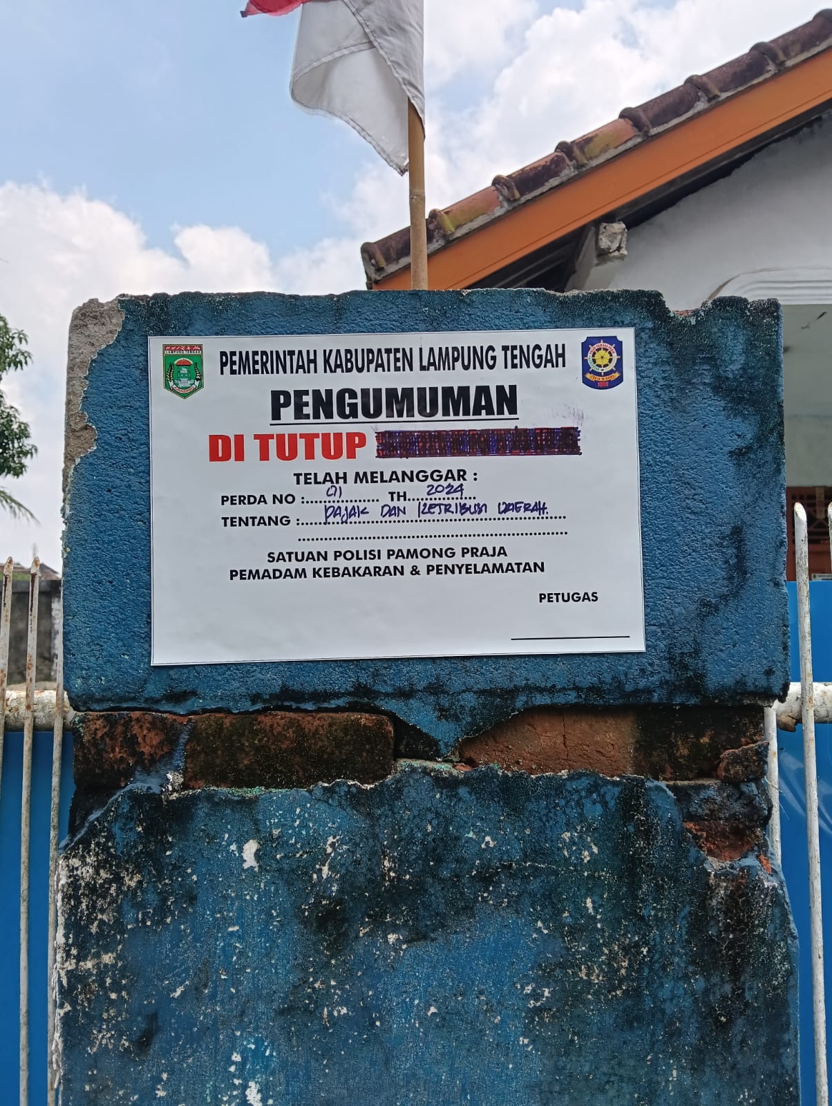 Jito Selaku selaku pejabat fungsional menerangkan pada hari senin tanggal 22/9/2025 Berdasarkan surat dari DPMPTSP Lampung Tengah Satpolpp secara resmi Menyegel/Menutup secara Permanen tempat usaha milik Sdr/i Meliwang,penutupan tersebut berdasarkan Perda no 1 Tahun 2024 tentang pajak dan retribusi daerah.
