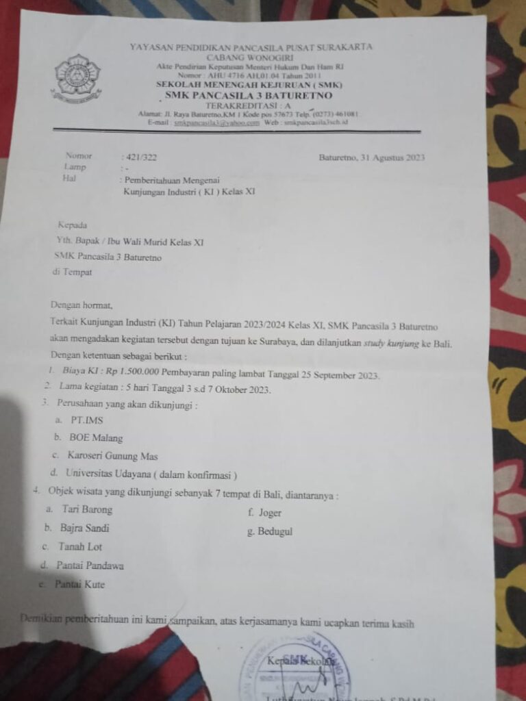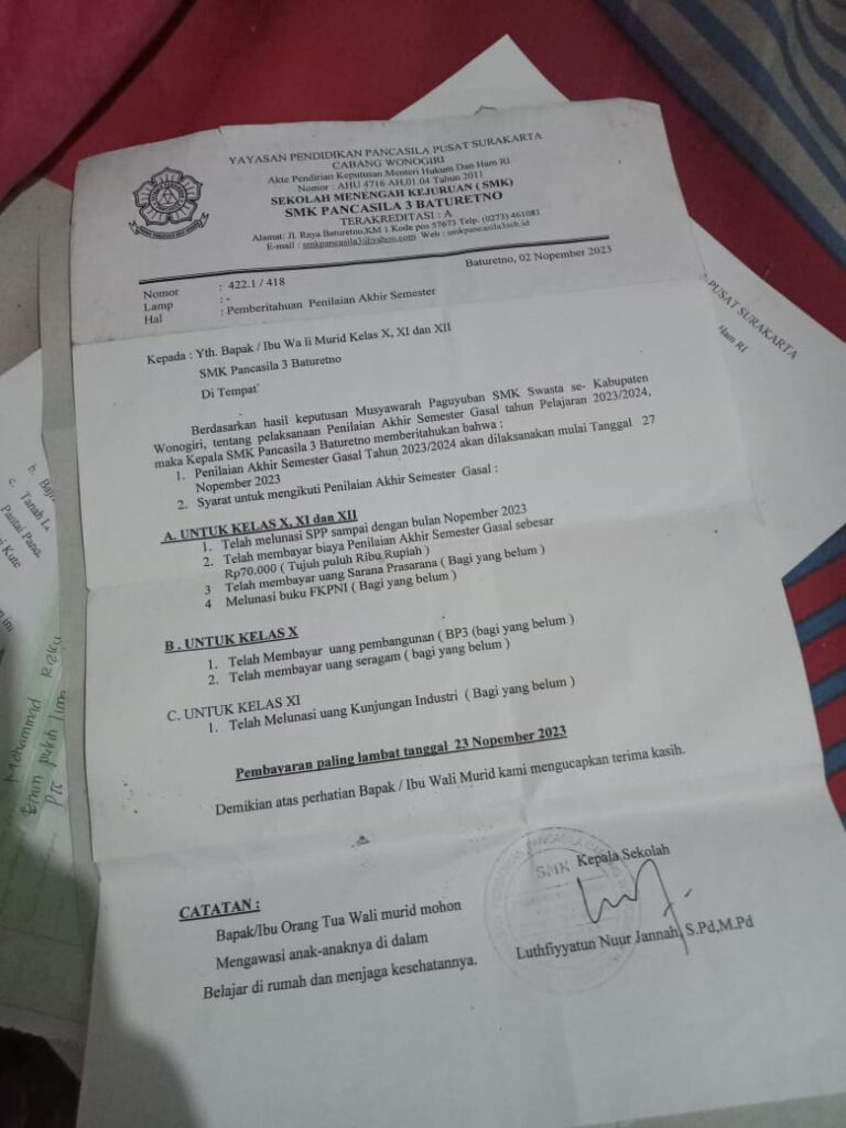 Namun dunia pendidikan di provinsi di jawa Tengah yang sangat memalukan ini membuat polemik warga yang mana SMK PANCASILA 3 BATURETNO WONOGIRI JATENG,, Telah membuat peraturan sendiri dengan melakukan pungli kepada wali murid.